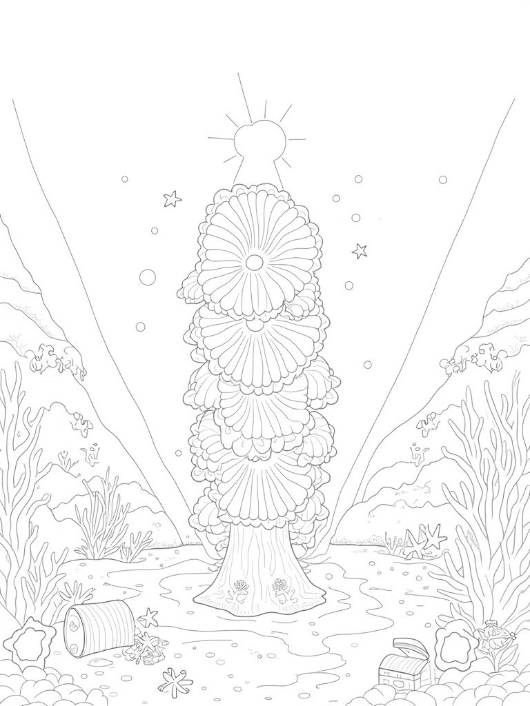 Underwater Garden with Spiraling Seashells and Coral Tree Coloring Page