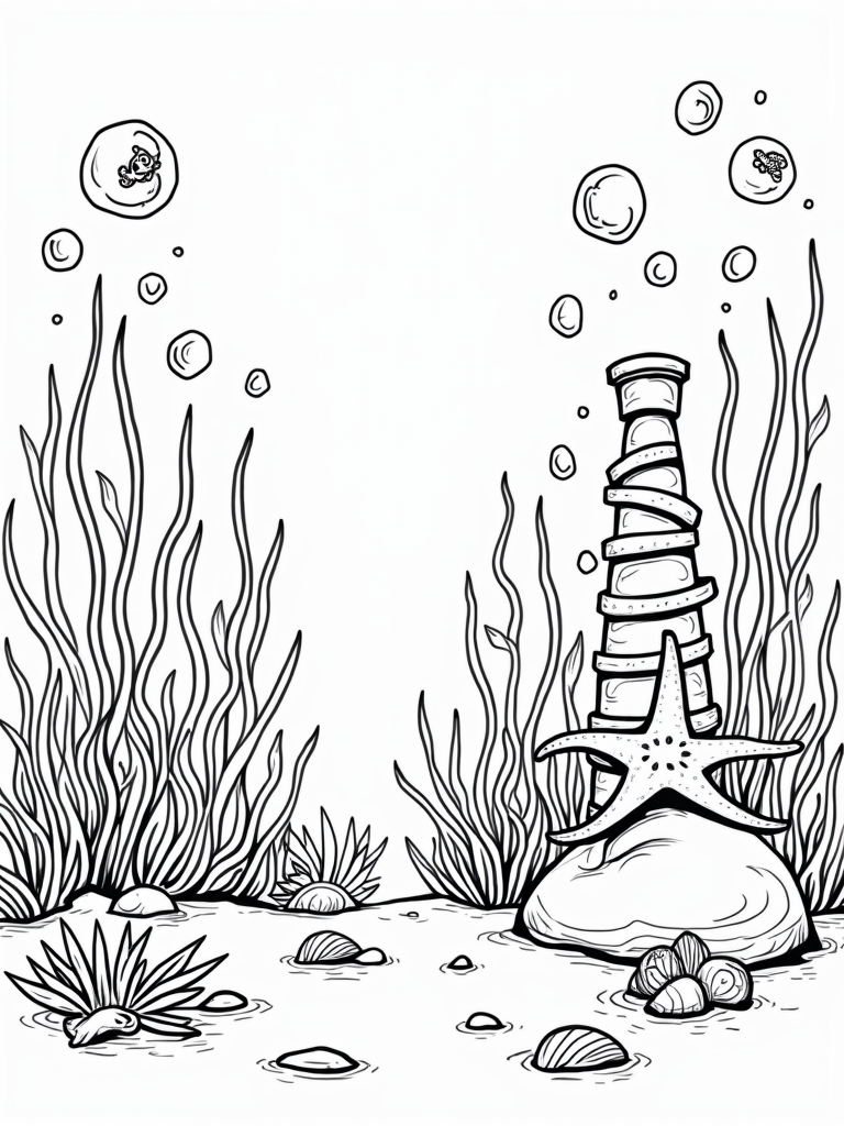 You’ll find a magical underwater meadow filled with giant, colorful seaweed that sways gently in the current. Look closely, and you might spot clusters of playful bubbles floating upwards, each with tiny fish peeking out, curious about their surroundings. A cheerful starfish relaxes on a smooth rock while a friendly octopus wraps its arms around a coral tower that looks just like a castle!