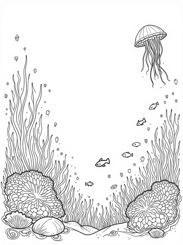Schools of fish dart through the garden, each one sporting unique patterns and shapes—just like the kids who will color them! Above it all, a luminous jellyfish glides gracefully, casting intricate shadows on the ocean floor. Don’t forget to look closely at the scattered seashells nestled among the seaweed; each one has its own special texture, waiting for you to bring it to life with your favorite colors.