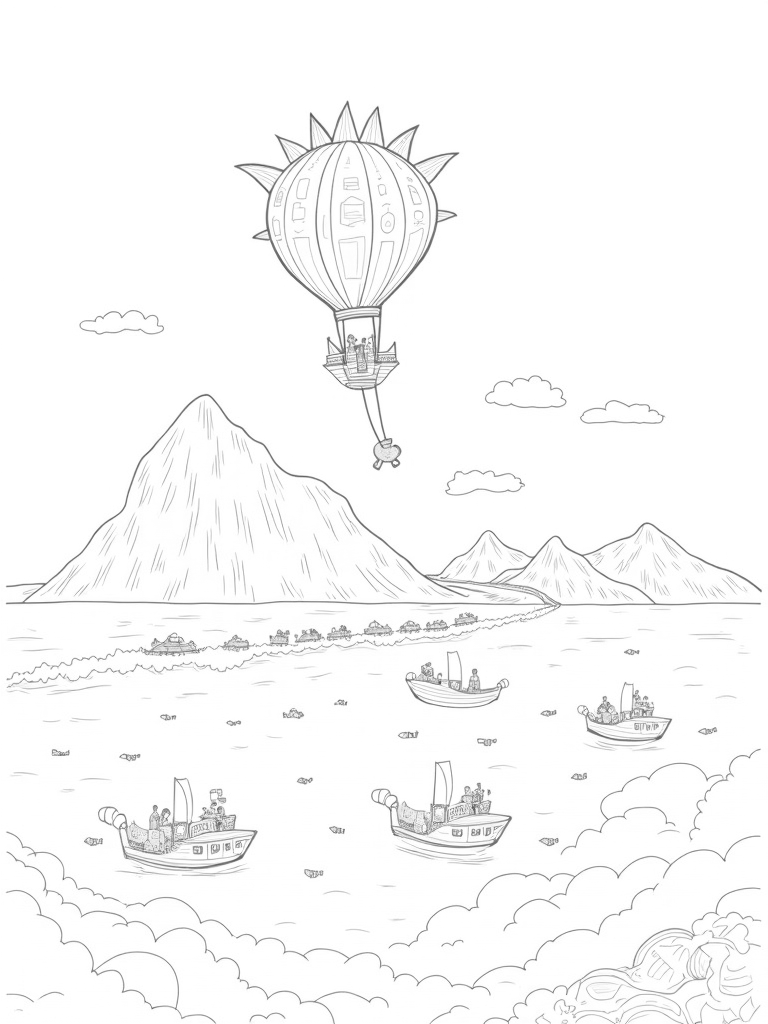 Up in the sky, a charming airship sails above soft, fluffy clouds. Its balloon looks like a giant sunflower, colorful and bright, while the wooden gondola below is decked out with vibrant sails. Just underneath, a sea of waves dances with playful fish-shaped boats, each one sporting its own unique patterns.