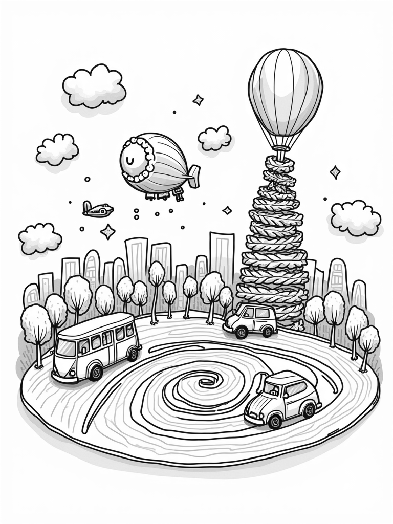 At the base of this cheerful landscape, a rainbow-colored road winds its way toward a roundabout formed by oversized steering wheels. How cool is that? The sun peeks out from behind a balloon truck, casting playful shadows across the scene. It’s a perfect spot for kids to let their creativity shine as they bring this cityscape to life with their favorite colors!
