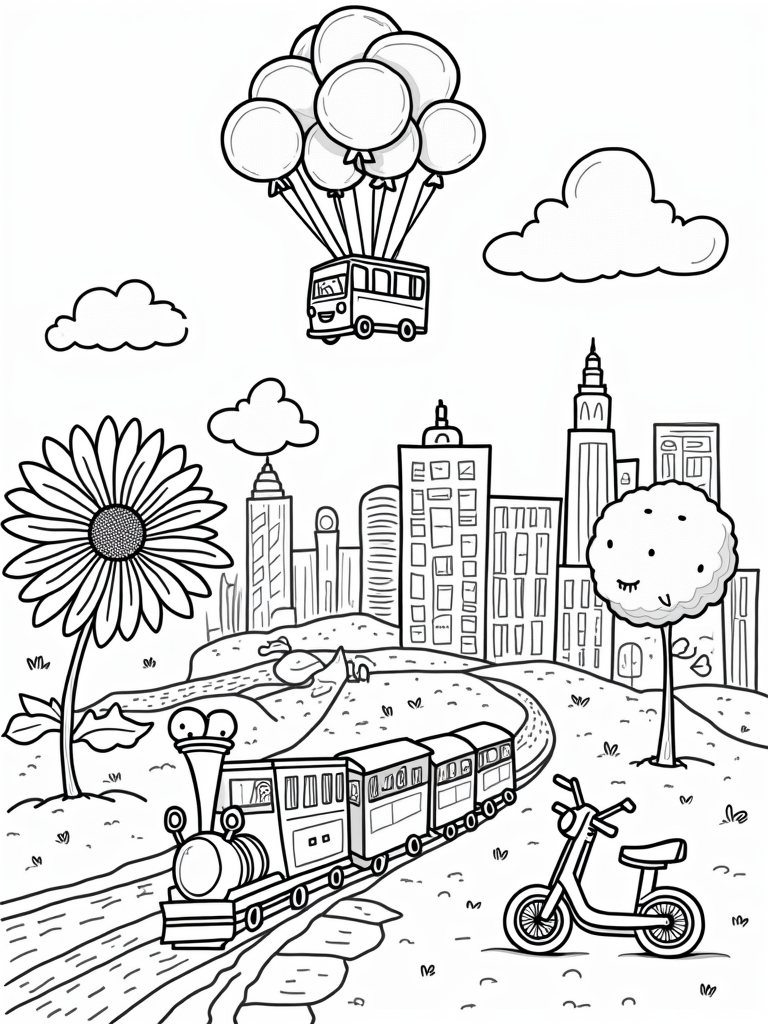 This coloring page brings a delightful cityscape to life! You can see a cheerful bus being lifted into the sky by a bunch of colorful balloons. Below, a winding road wraps around a giant sunflower with a big, friendly smile. It's such a happy scene, perfect for brightening up your day!