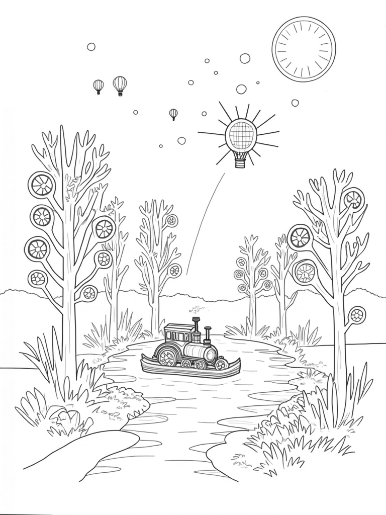 Bicycles in the Trees and a Floating Steam Engine Coloring Page