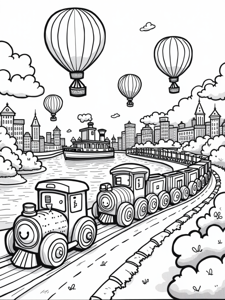 A friendly train is chugging along a rainbow track, with carriages that look like giant building blocks. It’s like a dream come to life! In the background, a charming ferry sails smoothly on a chocolate river, and its sails are covered in bright star patterns. Fluffy clouds with smiling faces add to the happiness of this scene, making it perfect for a fun coloring session.