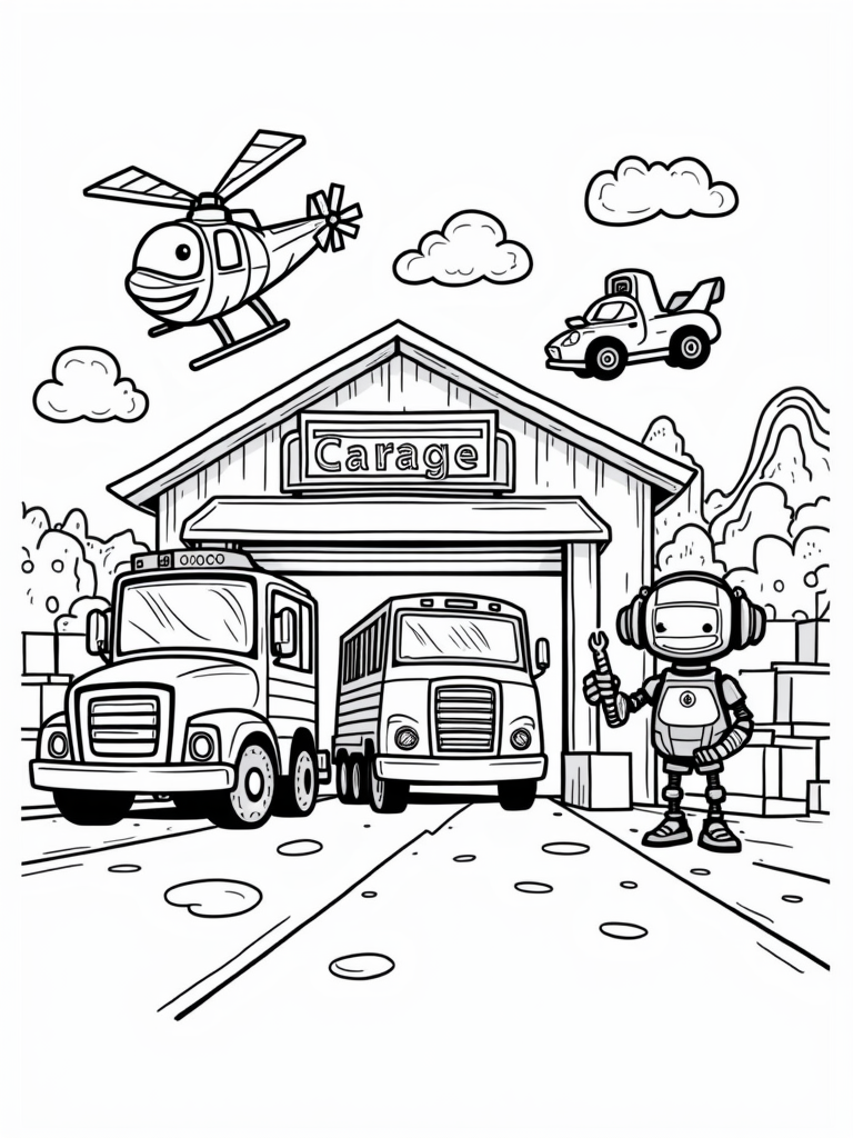 In the corner of the garage, there’s a friendly robot mechanic holding a wrench, ready to lend a hand with any vehicle repairs. This little guy adds a playful element to the picture, making it perfect for kids who love vehicles and robots. It’s a colorful and imaginative setting that sparks creativity, making it a great choice for a fun coloring session!
