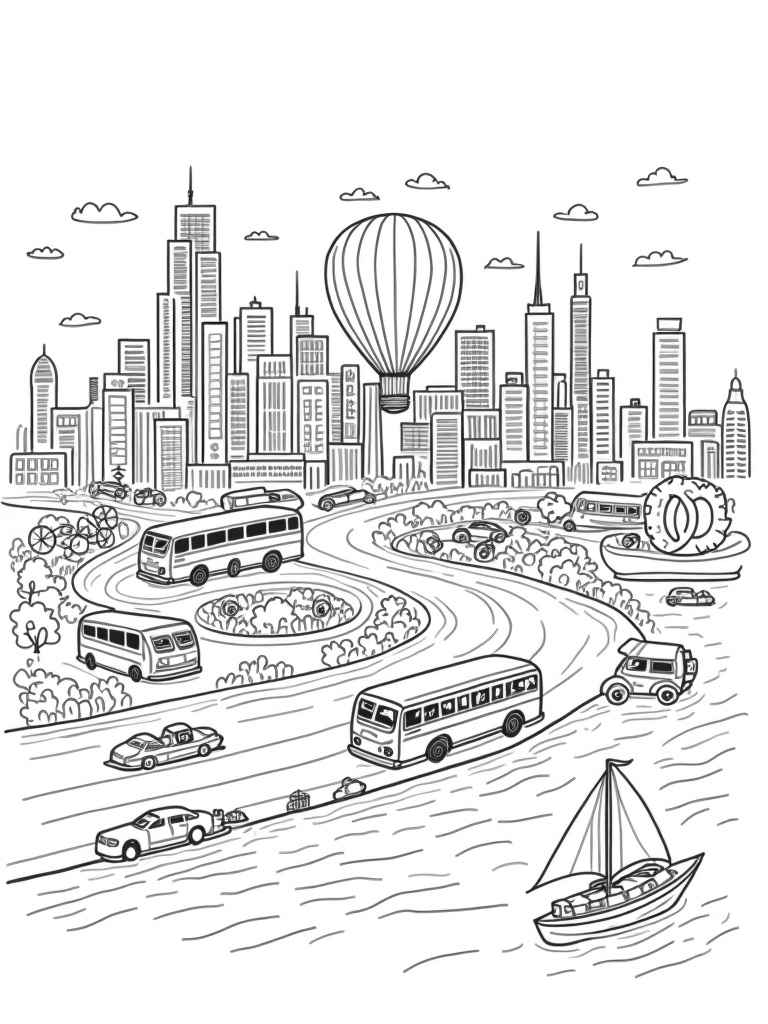Cityscape of Vehicles: Buses, Boats, and More Coloring Page