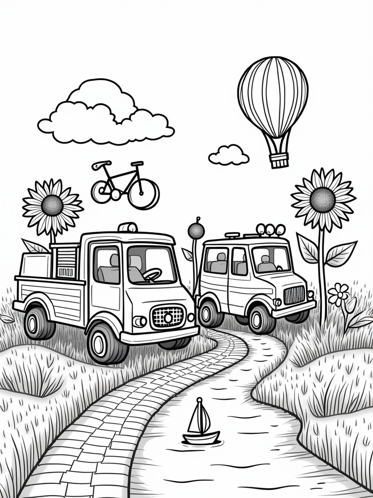 In this fun scene, cars bloom like flowers, making for a delightful vehicle farm! You’ll find a bright red fire truck and a cheerful yellow school bus with big wheels, surrounded by soft, oversized green grass. Look up, and you’ll see a friendly turtle-shaped hot air balloon floating lazily in the sky, adding a whimsical touch to the whole picture.