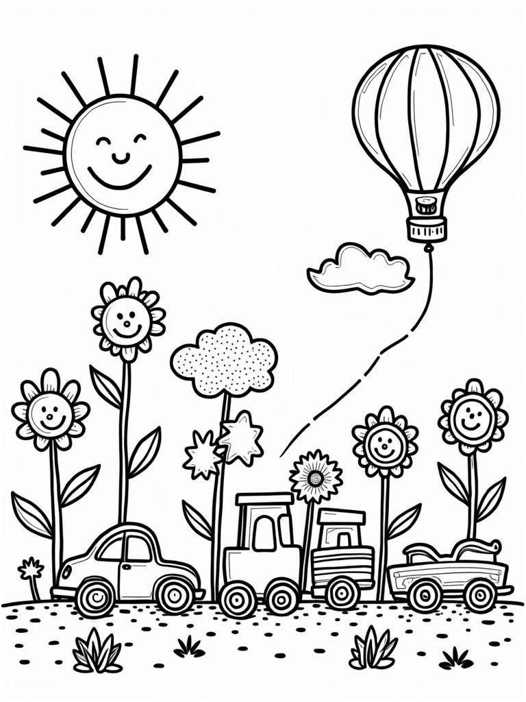 Above the scene, a giant balloon-shaped hot air balloon floats, happily tethered to a sun that’s got a big smile on its face. It’s a sunny day in this whimsical vehicle garden! Scattered around the garden are playful traffic signs that look like cute animals, each one bursting with colorful patterns and happy expressions, making it a delightful place for kids to color and imagine.