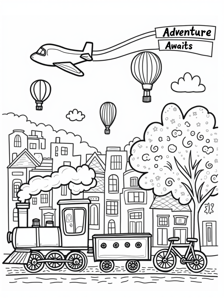 If you look closely, you’ll spot a giant bicycle with oversized wheels leaning against a quirky tree. The tree is adorned with bright, swirling leaves that look like they’re dancing in the breeze. It’s the perfect spot for a little imagination to take flight! And don’t forget about the playful airplane zipping through the fluffy clouds, trailing a cheerful banner that says, “Adventure Awaits!”