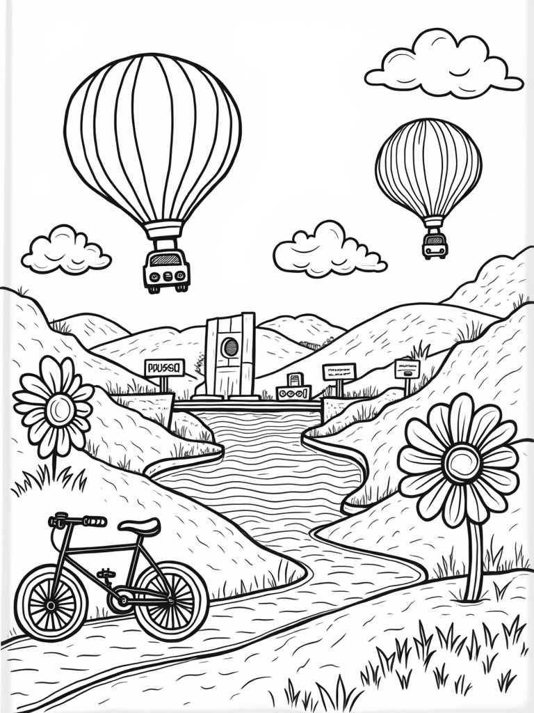 Imagine a sunny day filled with colorful hot air balloons that look just like cars, floating peacefully in a bright blue sky. Below, a winding road made of rainbow bricks twists through gentle hills, with oversized traffic cones and playful signposts adding a touch of fun. You can spot a cheerful bicycle with giant wheels leaning against a massive flower, its petals spiraling out like a colorful spiral candy!