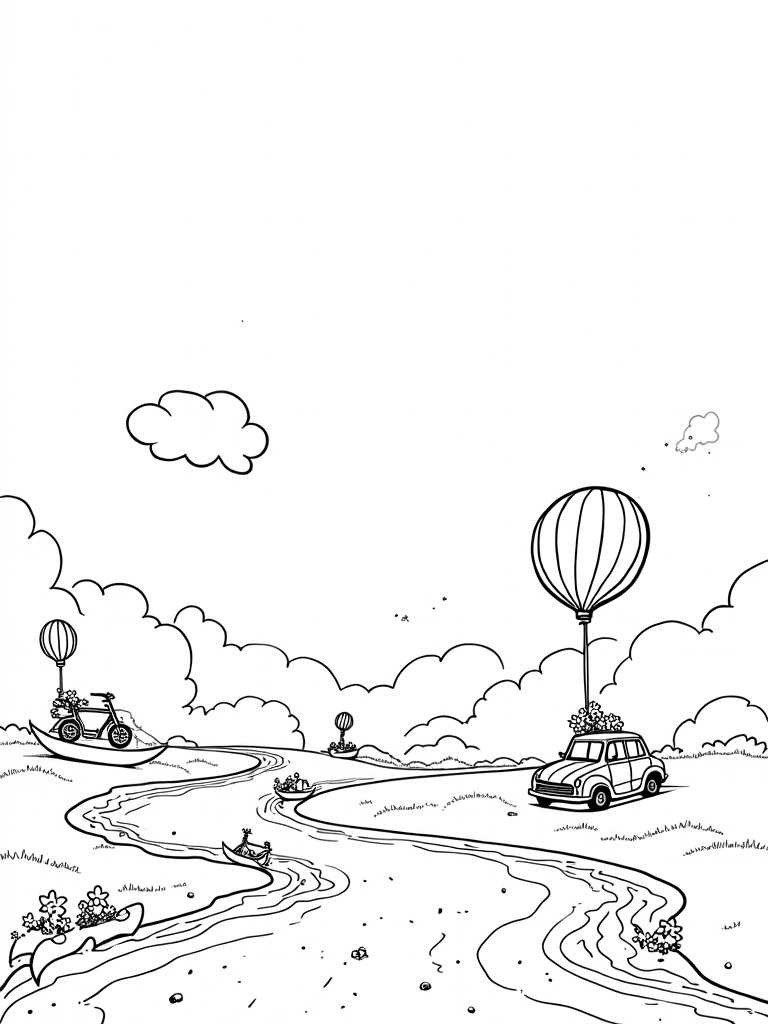 Imagine a sky where bicycles float like clouds, their wheels transformed into bright, cheerful balloons! Below them, a river of sparkling paint winds its way through the scene, with colorful kayaks gliding along the shimmering surface. It’s a delightful mix of fun and imagination!