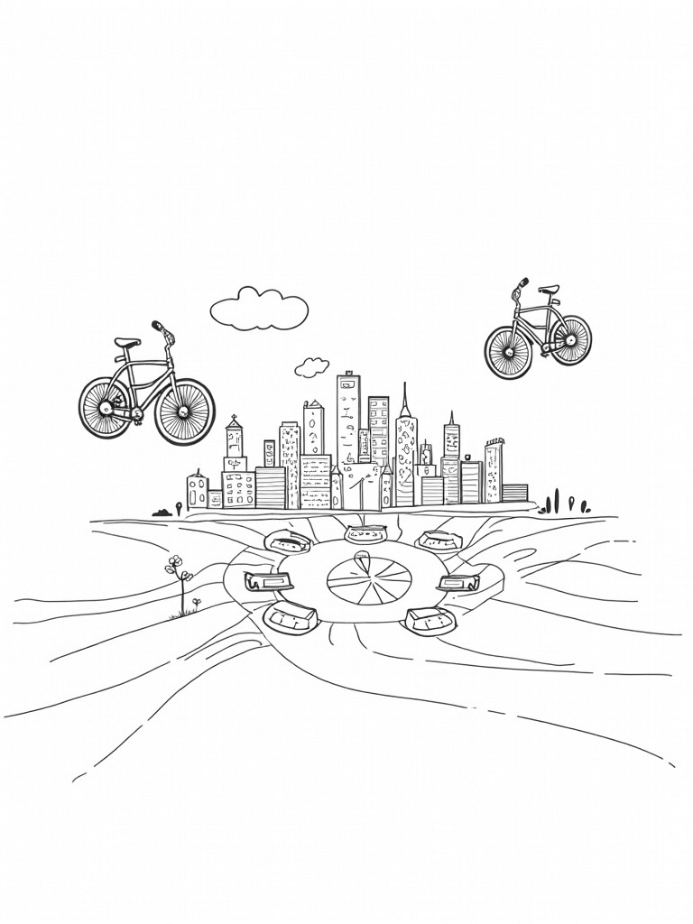 Imagine a city where bicycles float above the ground like colorful hot air balloons! In this playful scene, you’ll see oversized bikes with spinning wheels, drifting lazily in the sky. Below, a vibrant river of paint flows through the streets, and small boats made of crayons bob along, ready to take you wherever your imagination leads.