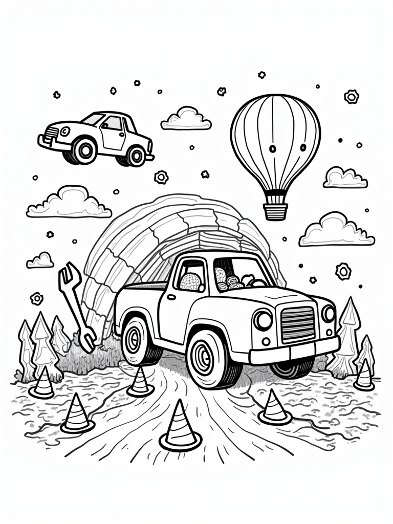 Check out this free, printable coloring page featuring a whimsical vehicle workshop with floating cars and candy roads! Perfect for little ones who love vehicles, this fun design encourages creativity and brings smiles. Grab your crayons and get started!