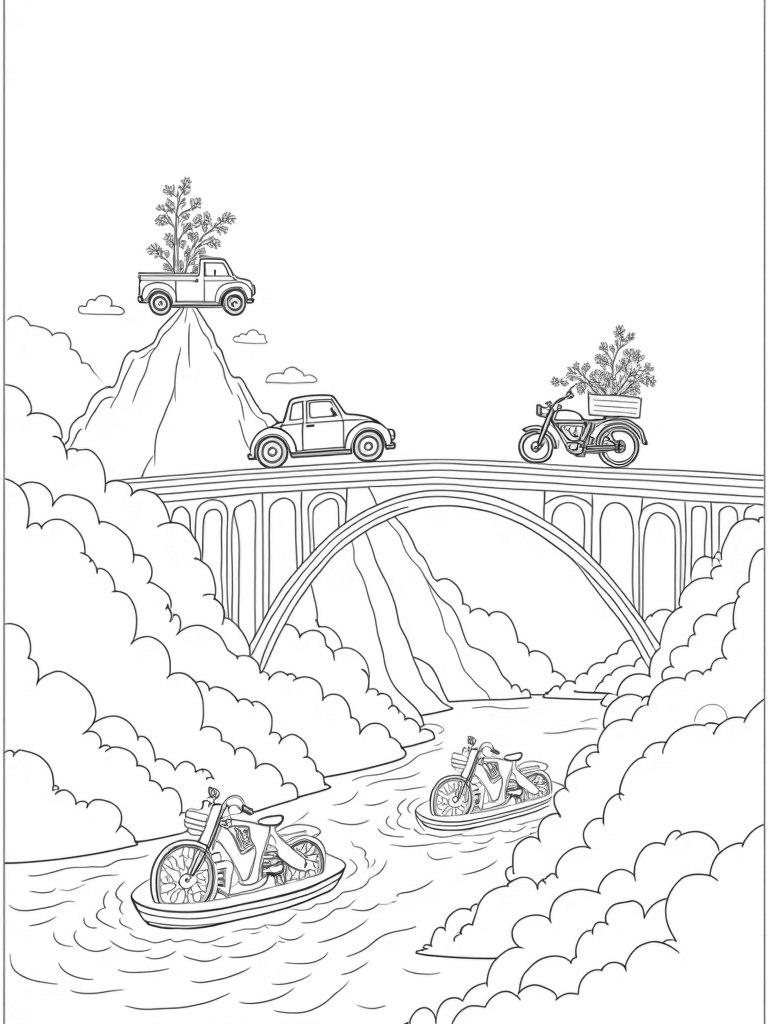 Picture this: cars floating on fluffy clouds, their wheels swapped out for spinning propellers! Below, a vibrant river teems with boats shaped like giant shoes, leaving behind trails of colorful smoke. A unique bridge made of bicycle frames arches between two hilltops, adding a fun twist to the scene. On one side, a vintage truck bursts with blooming flowers from its bed, while on the other, a sleek motorcycle balances on a wobbly beam. It’s a bustling, magical city where imagination takes the front seat!