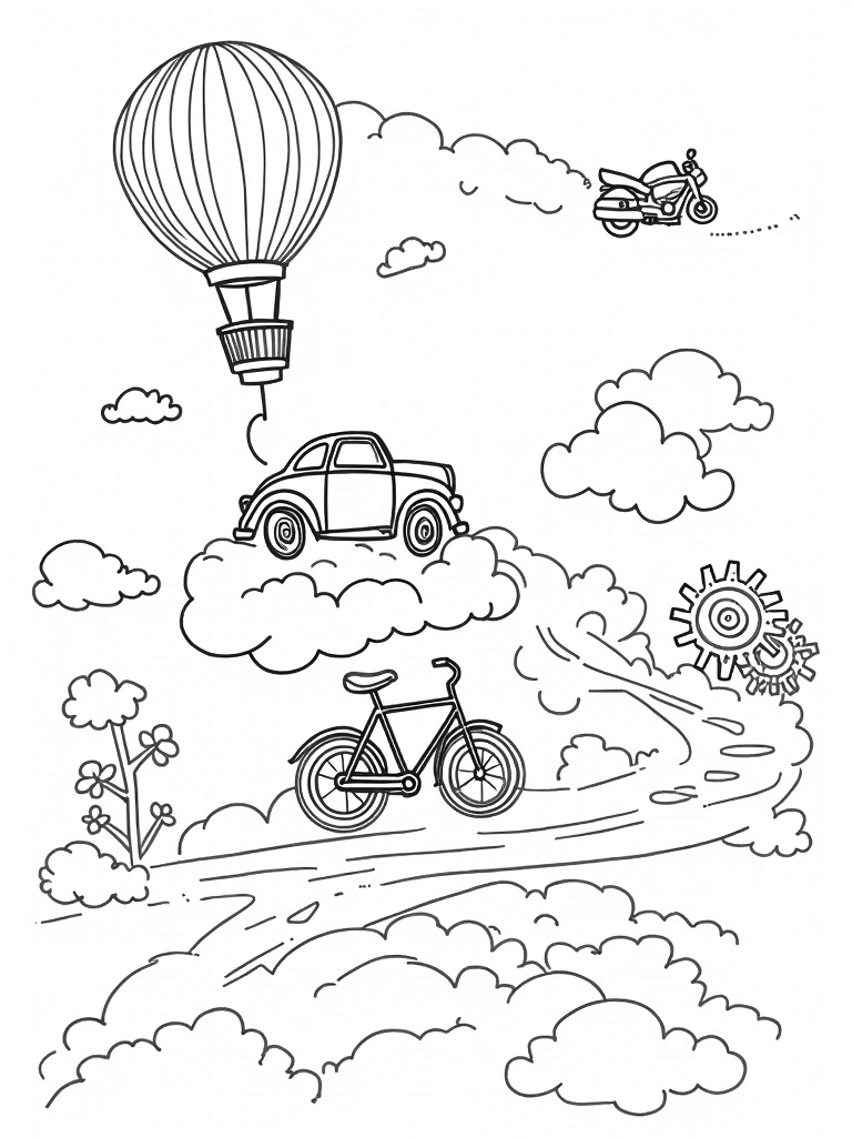Grab your favorite crayons or markers and let your creativity soar! You can color the hot air balloon in a rainbow of colors, or maybe give each vintage car a unique look. The possibilities are endless! Plus, you’ll have a blast filling in the clouds and the whimsical road. Don’t forget to add some sparkle to the stars left by the futuristic motorcycle gliding in the distance.