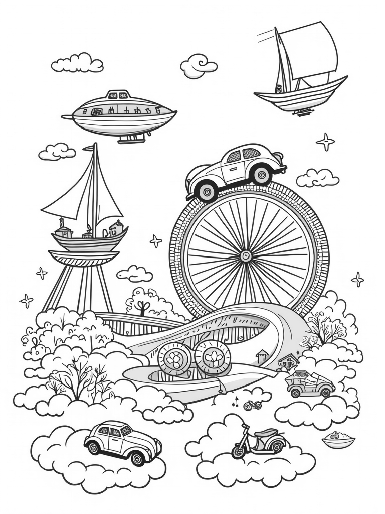 Scattered across fluffy clouds are colorful scooters just waiting for someone to hop on and zoom around. Each one looks like it’s bursting with personality, ready to take off on a fun ride through this whimsical world. Grab your crayons and let your imagination take flight!
