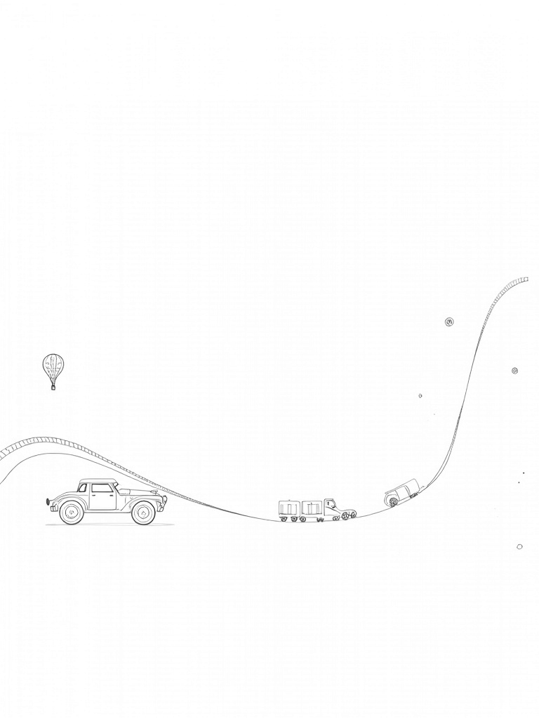 As you color, keep an eye out for the whimsical traffic signs shaped like balloons scattered along the road. Nearby, a hot air balloon shaped like a giant tire drifts peacefully, and a train of toy trucks is gliding on an invisible track, each one decorated with playful patterns. There’s so much to fill with color!