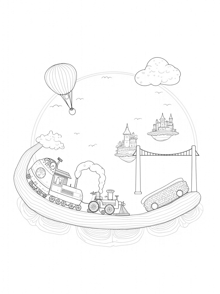 Check out this fun, free, printable coloring page featuring a whimsical cityscape with floating vehicles. Kids can color in a giant bicycle, a balloon-shaped car, and even a vintage steam train. Perfect for little artists who love vehicles!