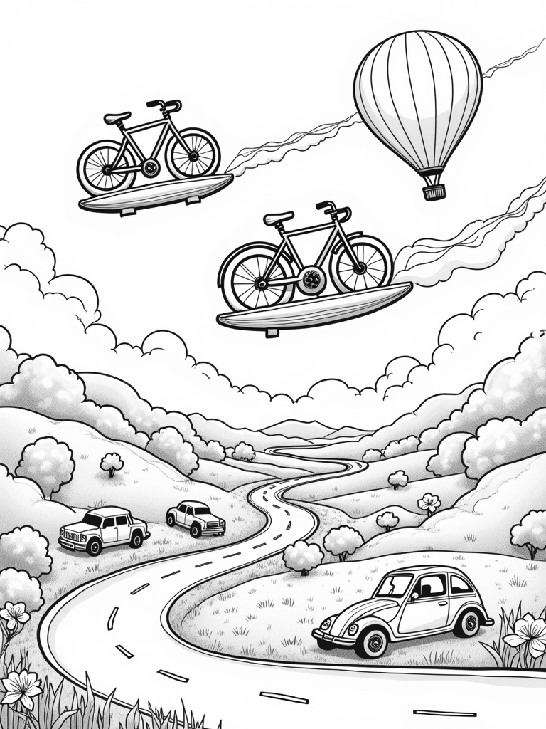 In this delightful scene, you can color a gigantic bicycle with oversized wheels drifting through the sky, right next to a sleek hovercar. Both are leaving trails of colorful smoke that swirl around the fluffy clouds above. Below, a winding river of roads meanders through fields filled with oversized flowers, where vintage cars and cute scooters are parked, adding a charming touch to the landscape.