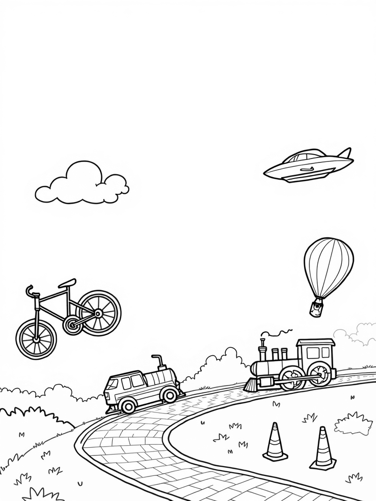 Floating Vehicles in a Whimsical Sky Coloring Page
