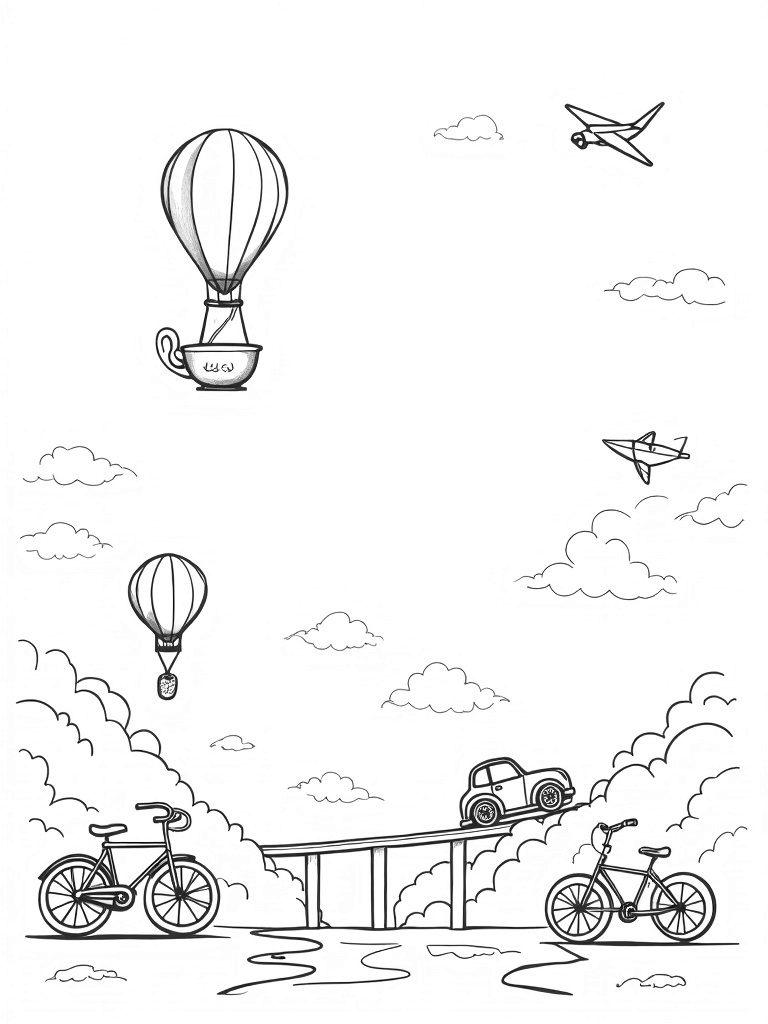 Floating Vehicles in a Whimsical Sky Coloring Page