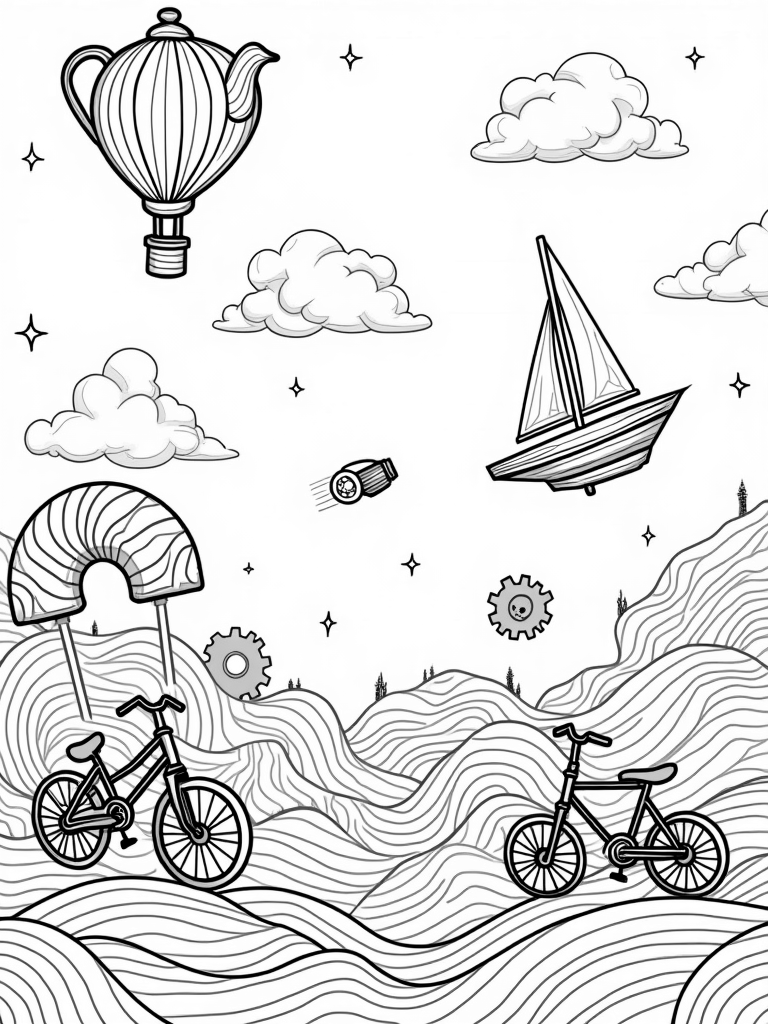 Floating Vehicles in a Whimsical Sky Landscape Coloring Page