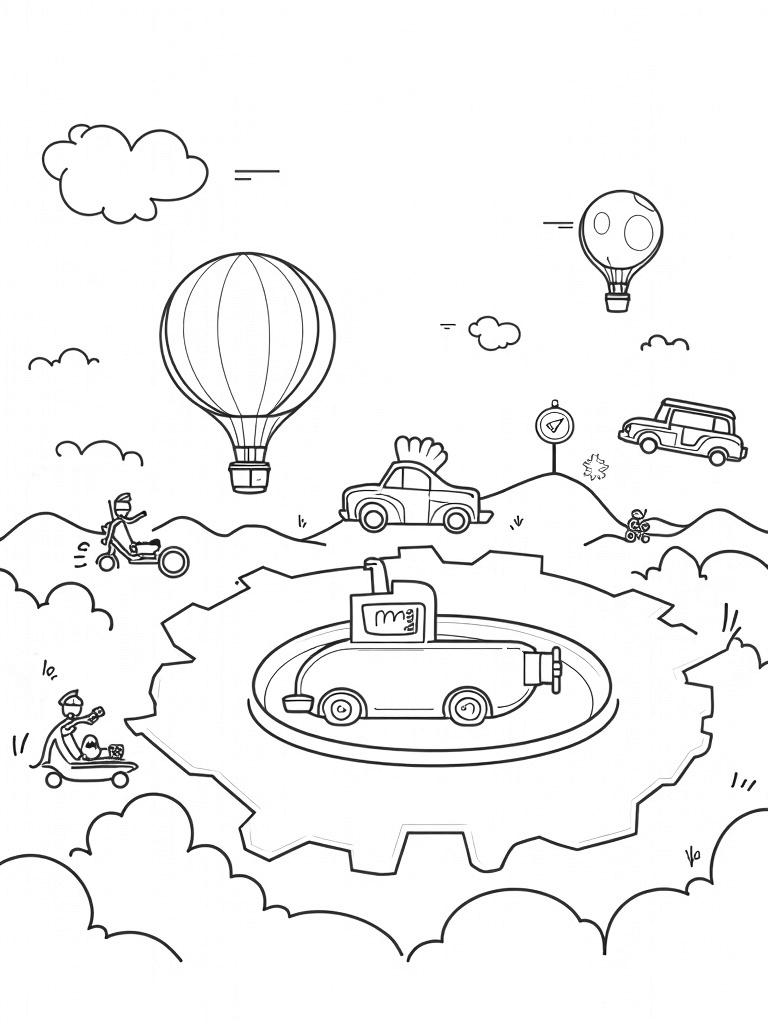 This coloring page is a perfect opportunity for kids to let their imaginations run wild. They can choose any colors they love for the vintage cars and clouds, making the scene come to life. Plus, the giant gear roundabout is just waiting for some bright colors to spin things up! It’s a fun way to explore creativity while enjoying some coloring time.