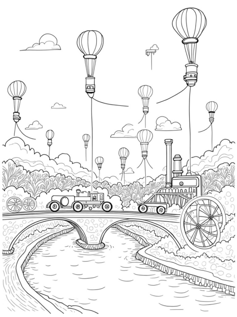 In the background, roller skate paths twist around a hill, inviting everyone to glide along. Up in the sky, hot air balloons shaped like various vehicles float by, making this scene all the more magical. It’s a blend of fun and creativity that sparks the imagination!