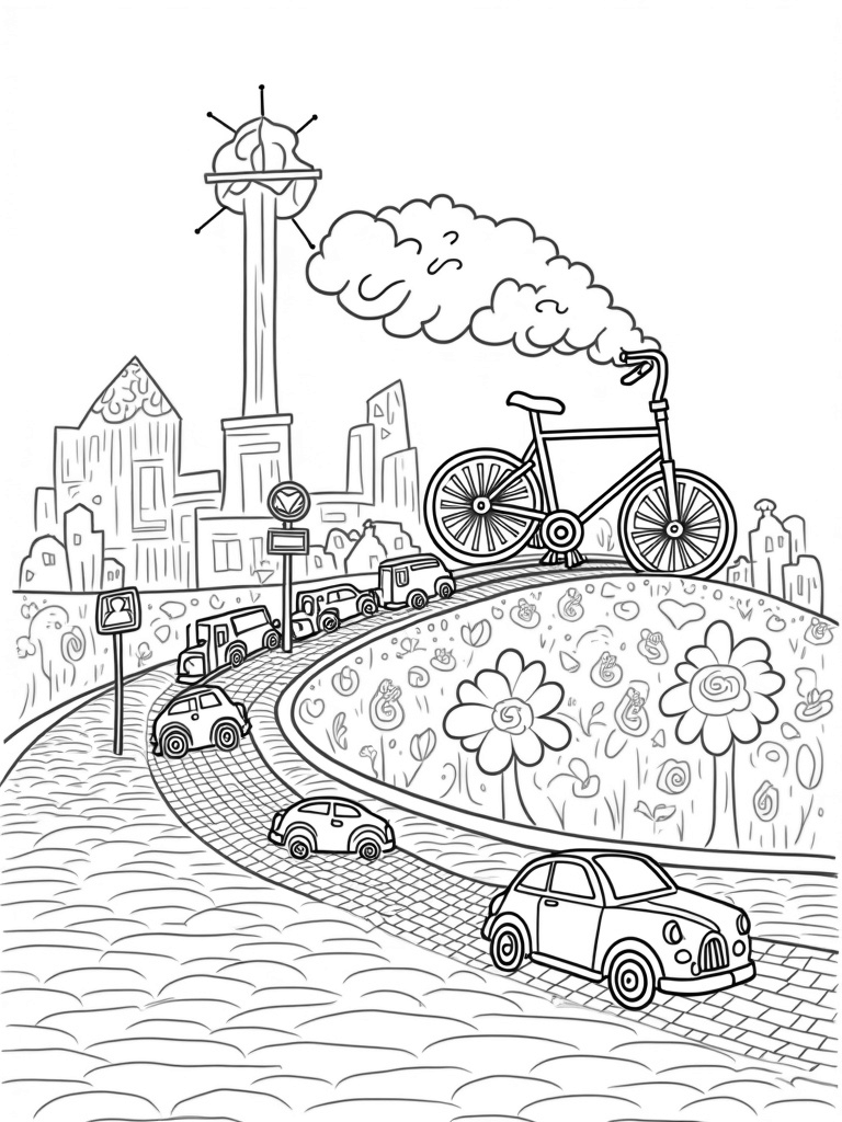 Check out this free, printable coloring page featuring a whimsical cityscape with flower cars, a giant bicycle, and a vintage train! Perfect for kids who love vehicles and creativity.
