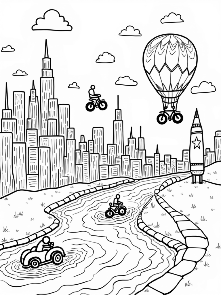 Flying Bicycles and a Pencil Rocket in a Colorful Cityscape Coloring Page