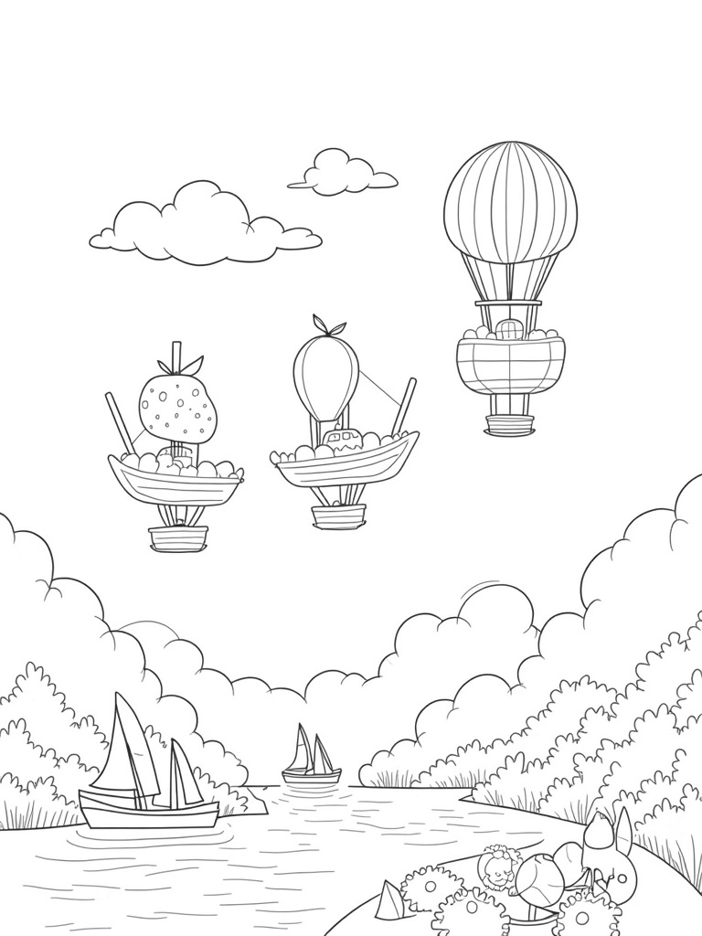 Imagine a fleet of airships floating high above the ground, each one looking like a different fruit! You’ve got a bright orange balloon hovering next to a green apple-shaped vessel, and a charming purple grape ship sailing smoothly through the fluffy clouds. Below them, a winding river sparkles with colors, reflecting the vibrant hues of the ships. Tiny sailboats shaped like garden tools bob along the river, adding a playful touch to the scene.