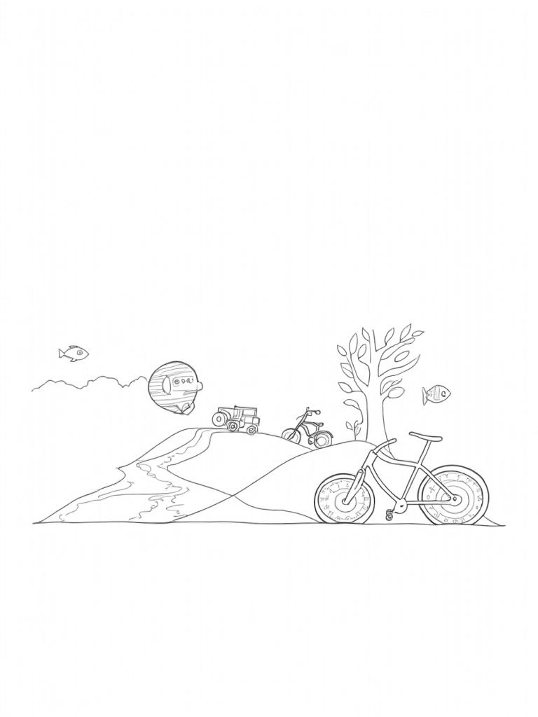 Giant Bicycle and Whimsical Vehicles in a Colorful Landscape Coloring Page