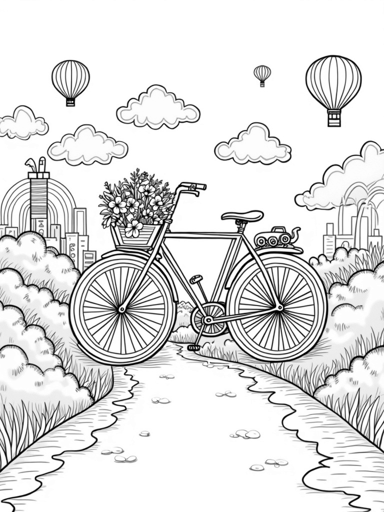 Giant Bicycle City with Cloud Car and Colorful Steam Engine Coloring Page