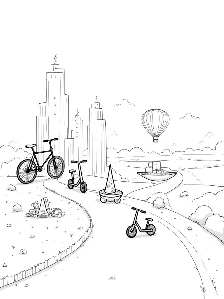 Imagine a world where giant bicycles stretch high into the sky, their wheels bursting with cool patterns just waiting for you to add some color! Nestled between these towering bikes is a road made of colorful paint spills, guiding the way to a magical paper sailboat floating among fluffy clouds. In the foreground, a bunch of playful scooters lean against a giant traffic cone, while a hot air balloon shaped like a vintage car drifts above, casting fun shadows on the ground.
