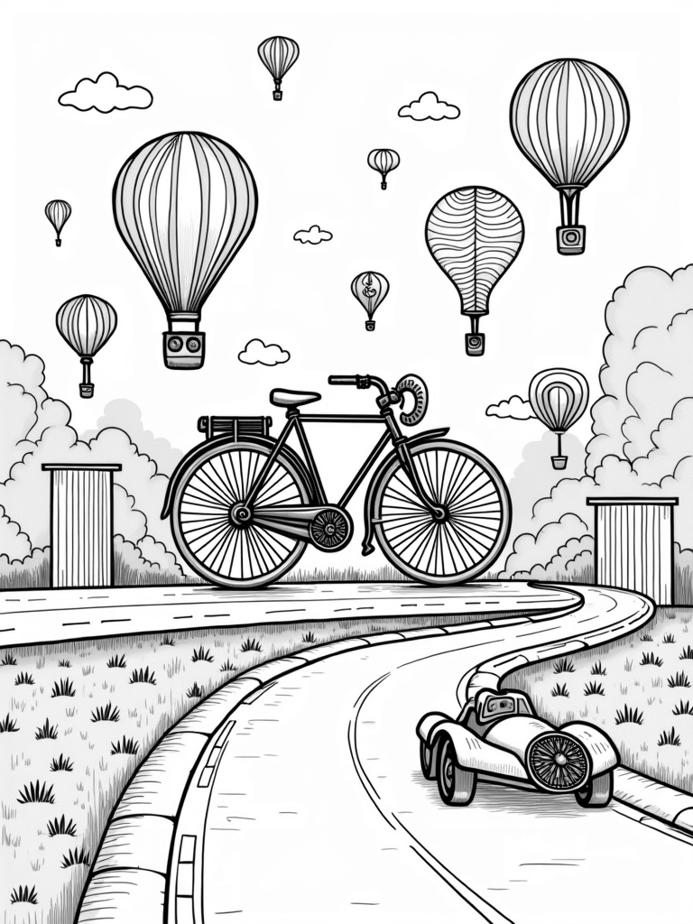 Check out this free, printable coloring page featuring a gigantic bicycle, vintage hot air balloons, and quirky traffic signs. Perfect for kids who love vehicles and imaginative cityscapes!