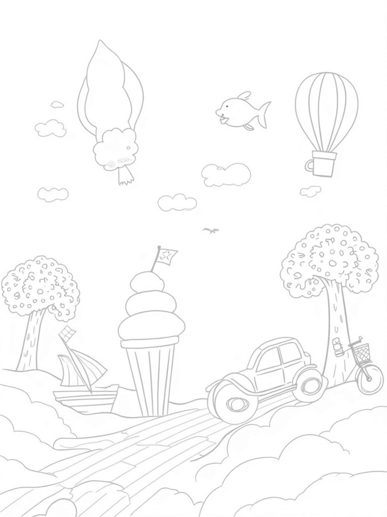 Look up and you'll see a sky filled with all sorts of colorful hot air balloons! There’s even a giant teacup and a friendly fish floating among the clouds. Below that, a winding road made of rainbow-colored bricks leads to a vintage car with oversized wheels parked next to a towering ice cream cone. Talk about a sweet ride!