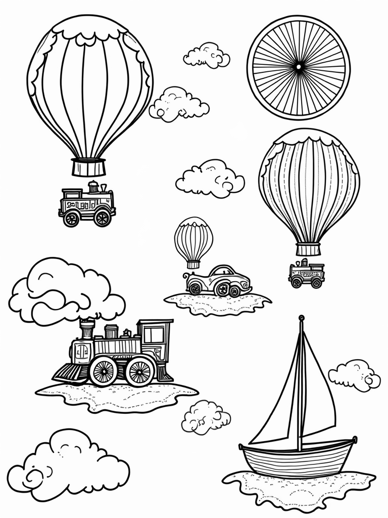 Check out this fun, free, printable coloring page featuring a whimsical sky filled with hot air balloons shaped like vehicles. Perfect for kids who love cars, trains, and boats, this coloring page is sure to inspire creativity!