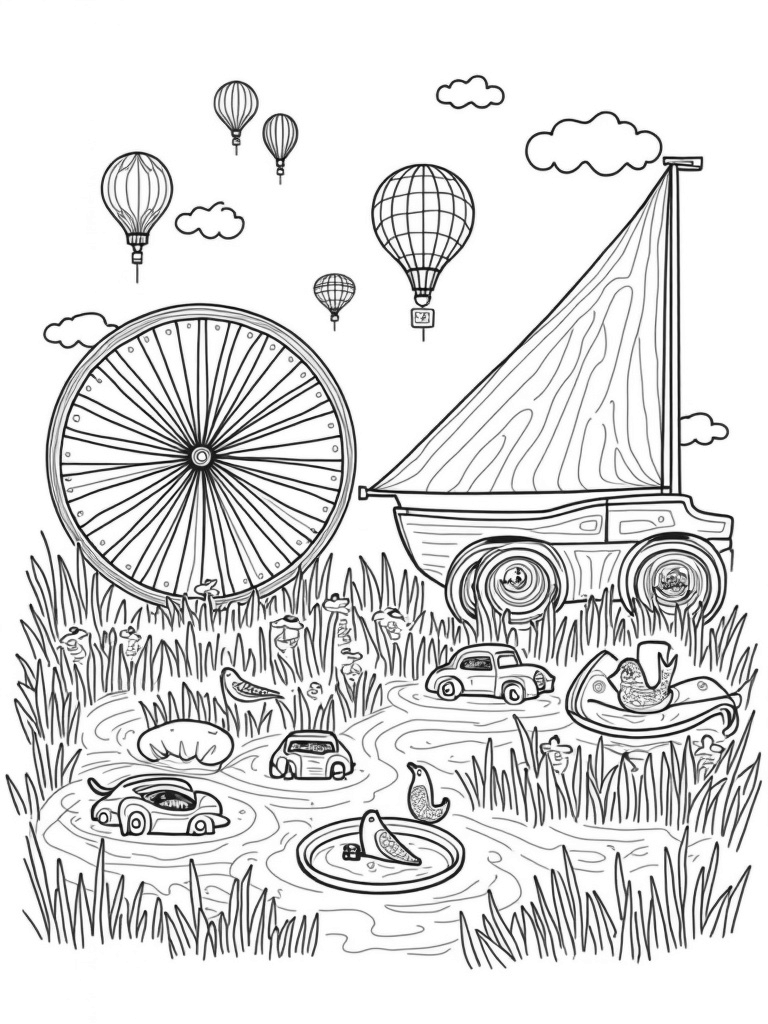 Mechanical Garden with Vintage Cars and Hot Air Balloons Coloring Page