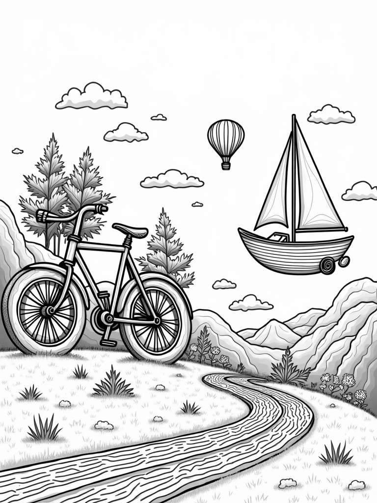 Nature and Vehicles Unite: A Bicycle, Car, and Sailboat Wonderland Coloring Page