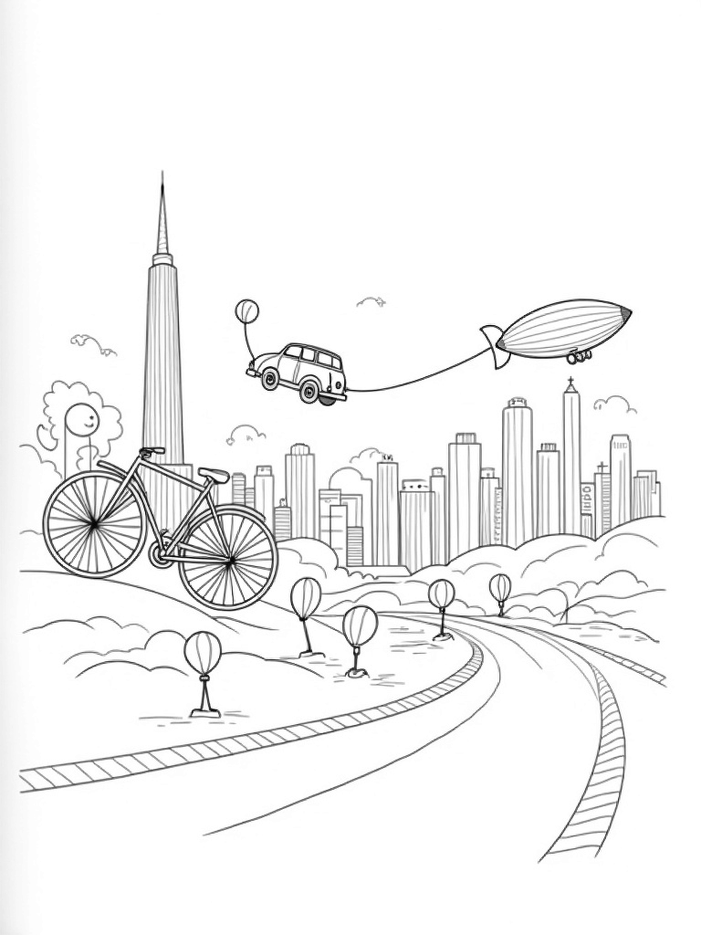 Imagine a city where everything is a bit larger than life! In this coloring page, you’ll find a giant bicycle with sun-like wheels resting against a skyscraper. The spokes are shining out like rays of sunshine, making it a bright spot in the skyline. Floating nearby is a vintage car, held up by a bunch of colorful balloons. It's like a scene straight out of a dream!
