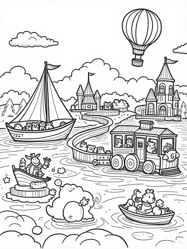 Just a little ways down the rainbow-brick road, there's a cheerful train full of oversized, friendly animals peeking out of the windows. Can you picture a giraffe waving at you? And look up! There's a hot air balloon shaped like a giant slice of cake floating softly among the fluffy, cotton candy trees. Imagine the sweet scents wafting through the air as you color this scene. It’s a delightful playground full of whimsical vehicles!