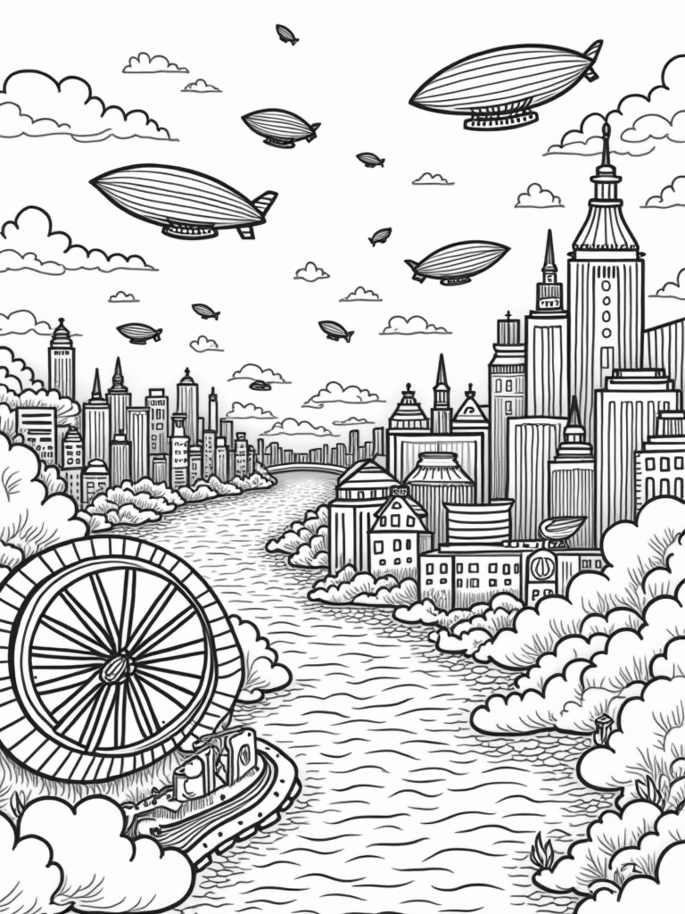 Sky City with Airships and Vintage Car Buildings Coloring Page
