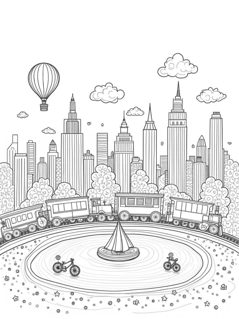 Steam Trains and Teacup Balloons in a Colorful Cityscape Coloring Page