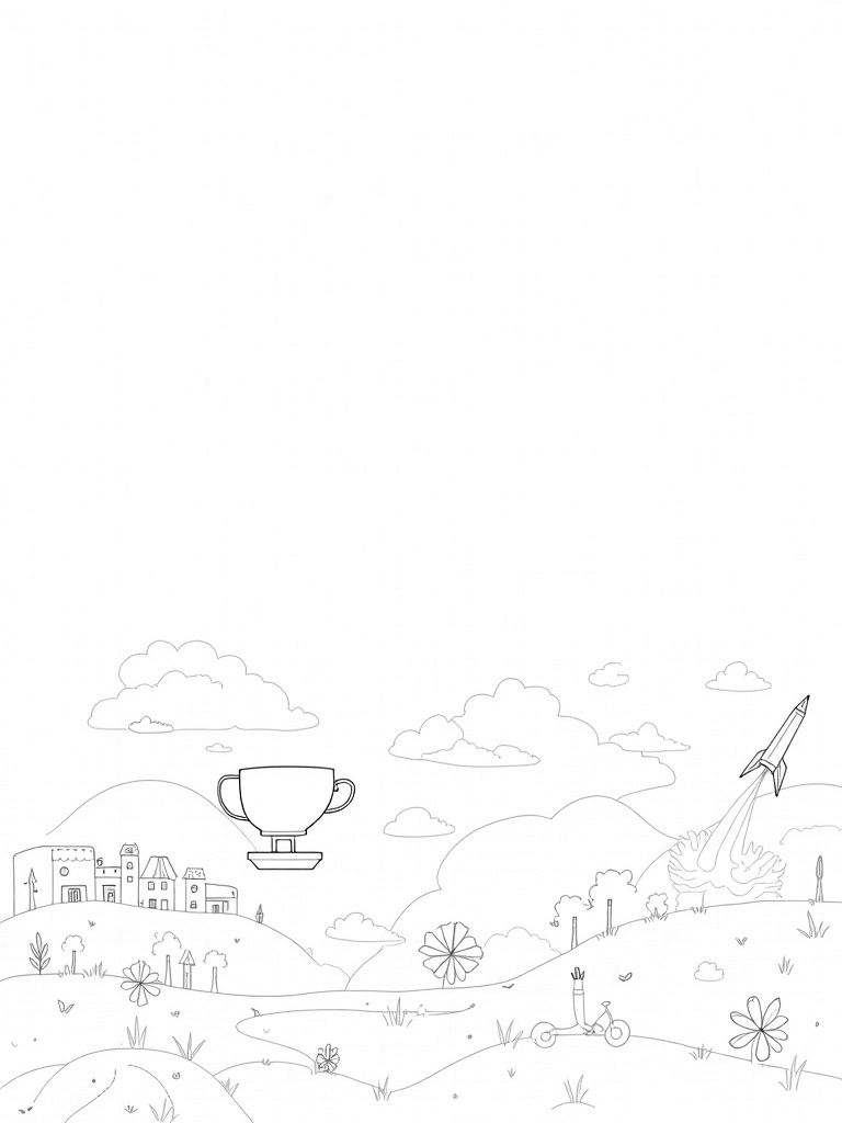 You’ll also spot a whimsical bicycle just hanging out in the sky, its spokes magically transforming into delicate flowers. Isn’t that a fun surprise? And in the distance, a giant pencil rocket is taking off from a hill, leaving behind a sparkling trail of stars. There’s so much to color and bring to life!