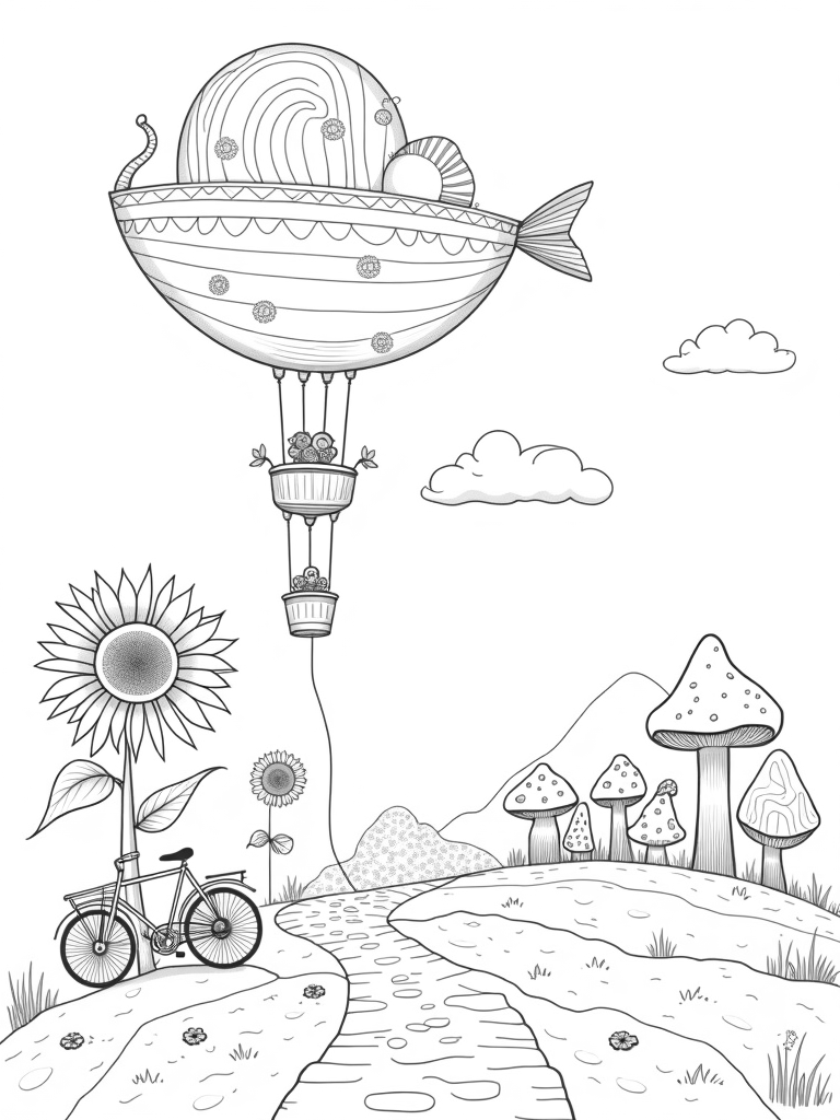 Floating high above a sea of fluffy clouds is a fantastical airship shaped like a giant teacup! Its hull is decorated with swirling patterns that will inspire your imagination as you bring it to life with colors. Trailing behind the ship are vibrant balloons, each one featuring intricate mandala designs just waiting to be filled with bright hues.