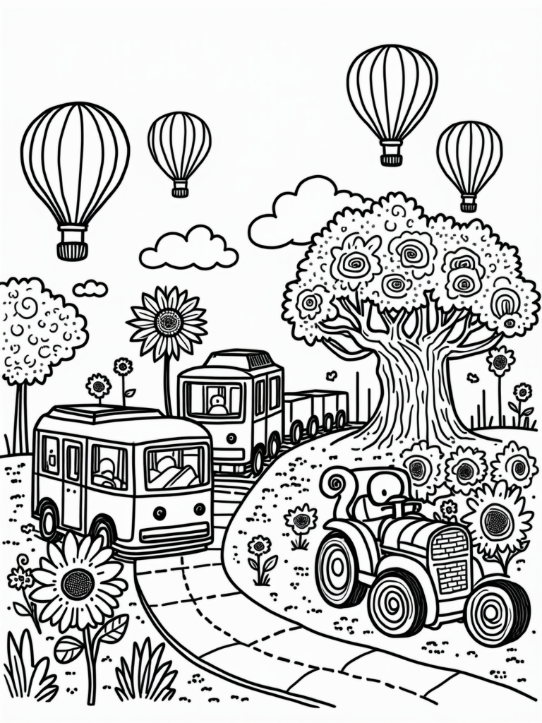 This coloring page is a delightful scene featuring a garden filled with colorful hot air balloons floating high above. Below, you’ll find giant, friendly cars shaped like animals, like a bright orange bus with big cartoonish eyes and a smiling blue bicycle decorated with flower-patterned wheels. The road is made of rainbow-colored bricks, winding its way towards a towering treehouse shaped like a vintage train!