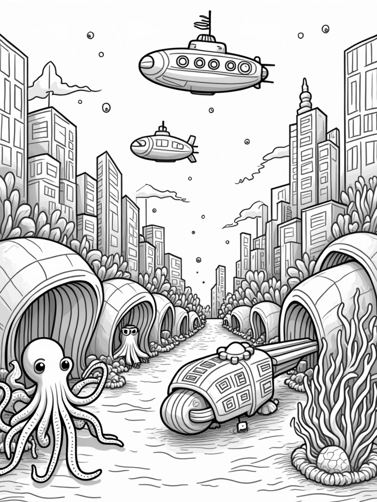 This coloring page shows a magical underwater city filled with vibrant submarines gliding through coral skyscrapers. You can spot giant seashells acting as garages, with friendly sea creatures peeking out to say hello. Don’t miss the bright octopus holding a steering wheel, looking ready for an oceanic ride!