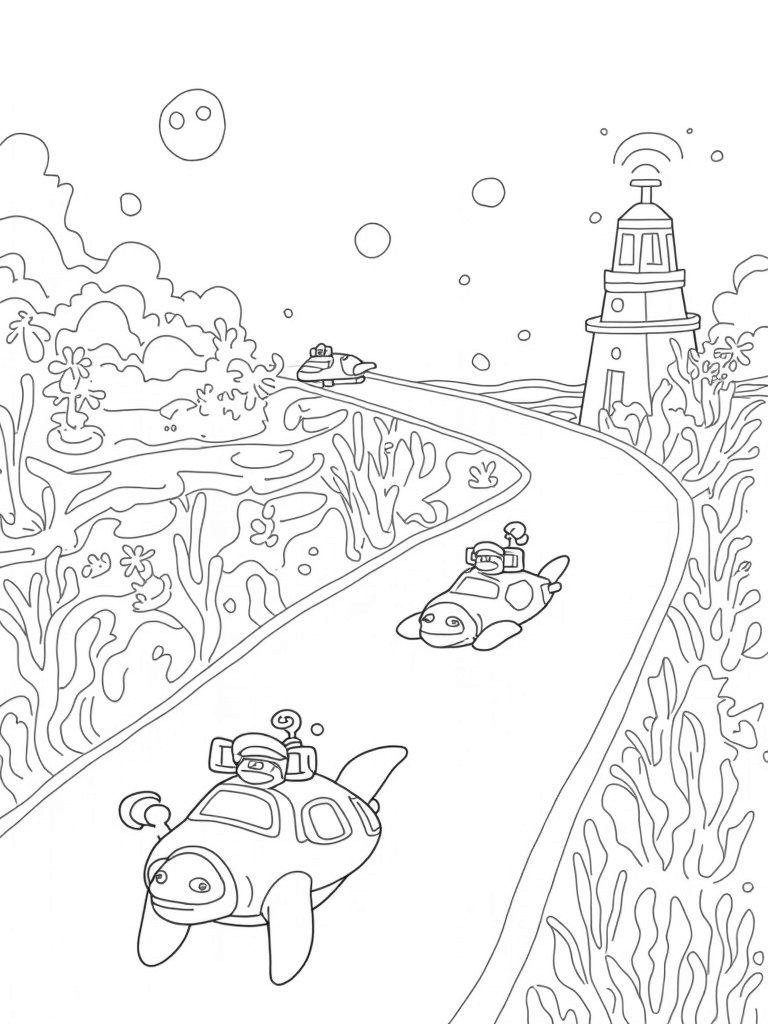 In the distance, there’s a lighthouse that’s shaped like a vintage car, shining its rotating light on schools of fish that look like little gears. It’s a sight to see! And don’t miss the big bubbles floating up from the ocean floor, each one holding tiny, fantastical vehicles like fish-shaped scooters and starfish taxis. It’s a whole world of underwater fun!