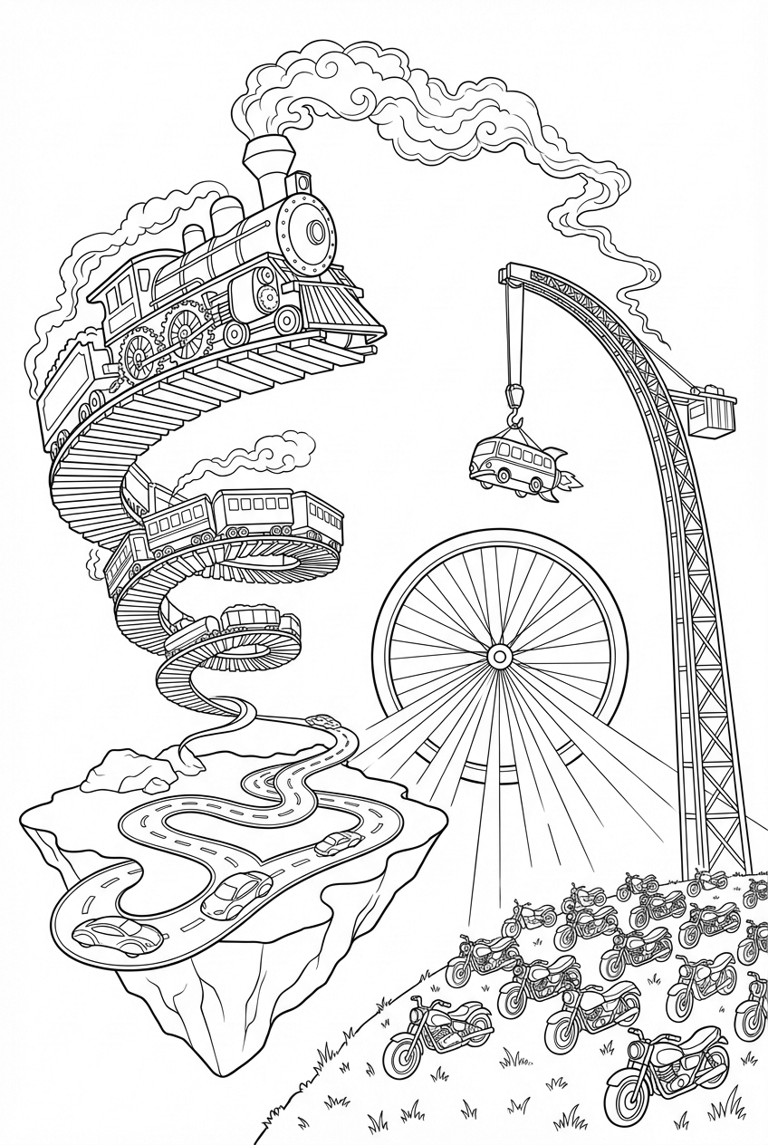Take a look at this wild mash‑up of machines. A massive steam locomotive twists upward like a spiral staircase, its smokestack puffing clouds that stretch into a misty bridge. Below, a ribbon‑like road wraps around a floating island where sleek hover‑cars zip in neat rows. Hovering overhead, a gigantic bicycle wheel spins, its spokes shooting out like sunbeams over a meadow dotted with parked motorcycles. And towering over everything, a freight crane arches sky‑high, its hook cradling a tiny rocket‑shaped bus.