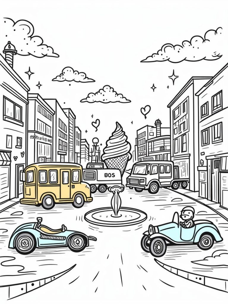 This coloring page brings a lively city scene to life, filled with all sorts of colorful vehicles! You’ll spot a bright yellow school bus parked by a roundabout, making it a perfect place for kids to hop on and off. Balloons are floating in the air, adding a festive touch to the scene.